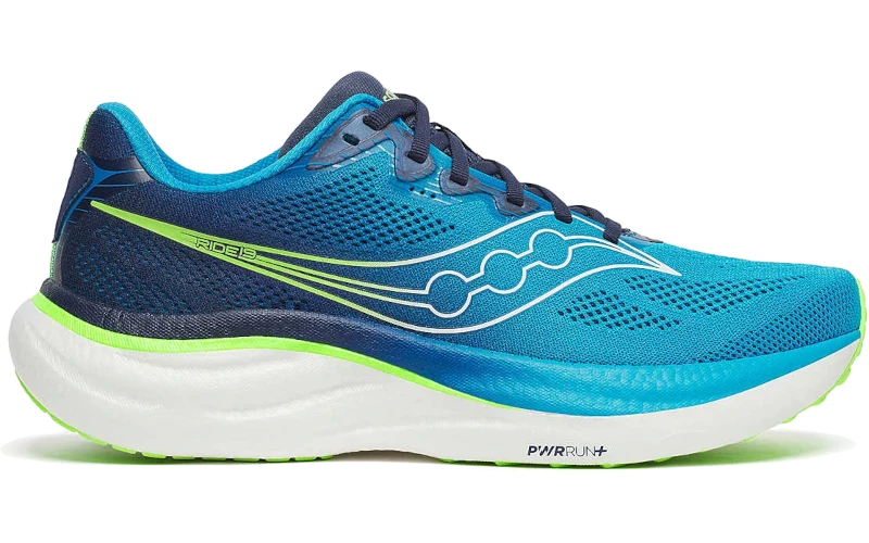 The Saucony Ride 19 has been included in the shoe guide for many years. With soft PWRRUN+ foam, it rivals its top competitors in comfort. Although it was designed primarily for easy, slow runs, it has surprising dynamism. Its slightly wider construction in the front makes everyday training more comfortable, making it a universal choice for runners looking for a balance of softness and functionality.